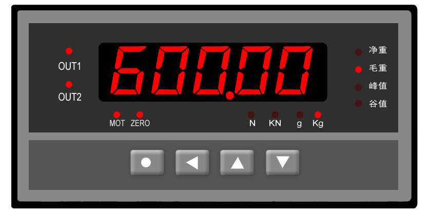 ⑥ 指示灯定义:12个指示灯,报警1、报警2、稳定、零点、毛重、净重、峰值、谷值、t、kg、g、kN。